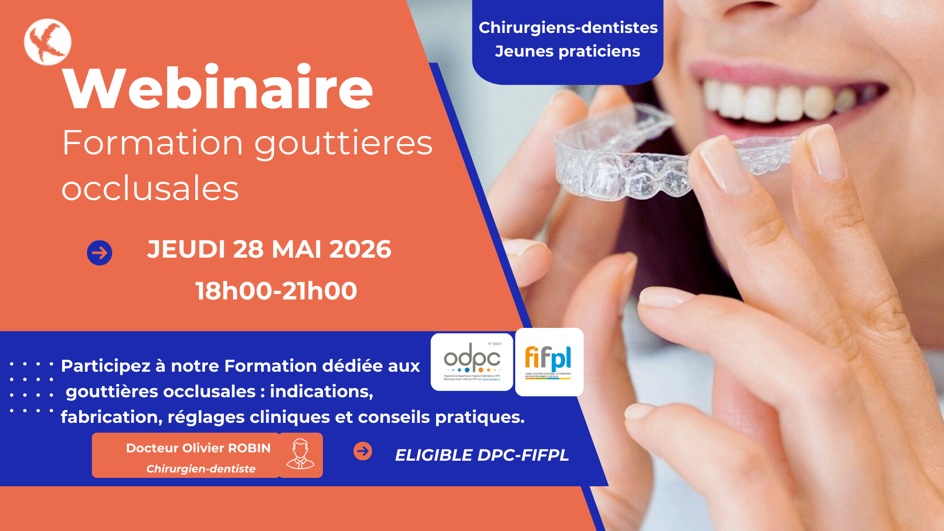 A travers cette formation, le Docteur Olivier Robin, spécialisé dans les gouttières occlusales, vous propose une approche rationnelle et simplifiée pour la réalisation des gouttières occlusales dans le cadre de la prise en charge des dysfonctionnements temporo-mandibulaires (DTM) et du bruxisme dans la pratique quotidienne.
