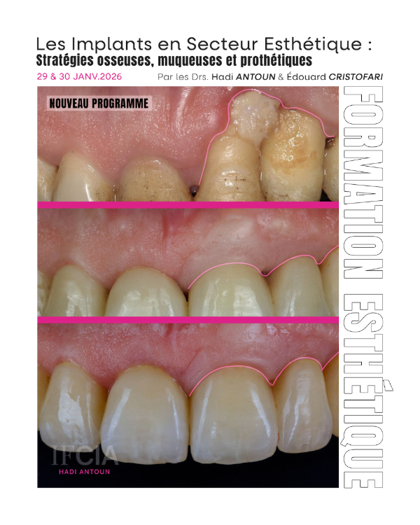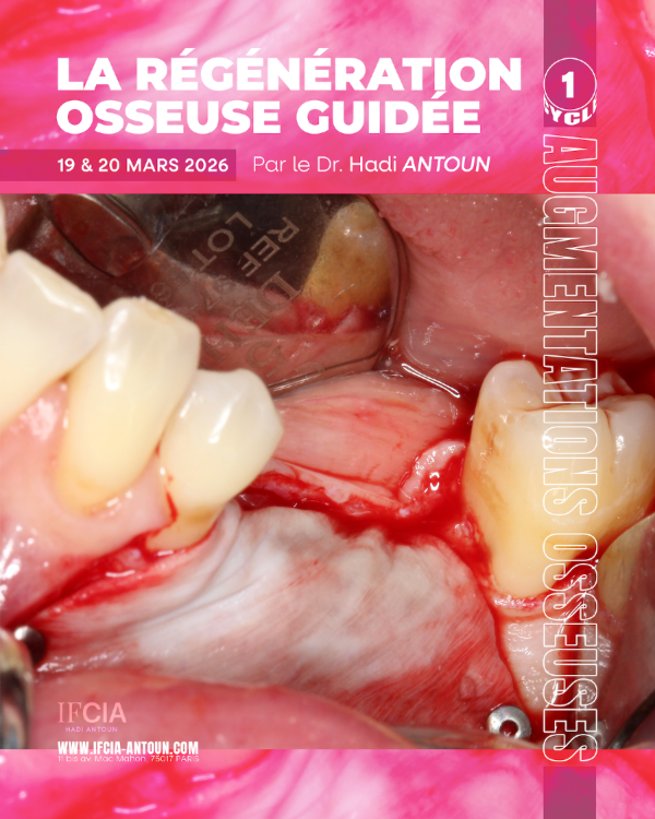 Le motto du Dr Hadi Antoun ? "De l'os, de l'os, de l'os !". Voilà pourquoi IFCIA a créé cette session. Ou comment faire en sorte que vos ROG, qu'elles soient en secteur antérieur ou postérieur, tiennent la route et dans le temps. De la théorie à la suture : comprenez, planifiez, régénérez ! |