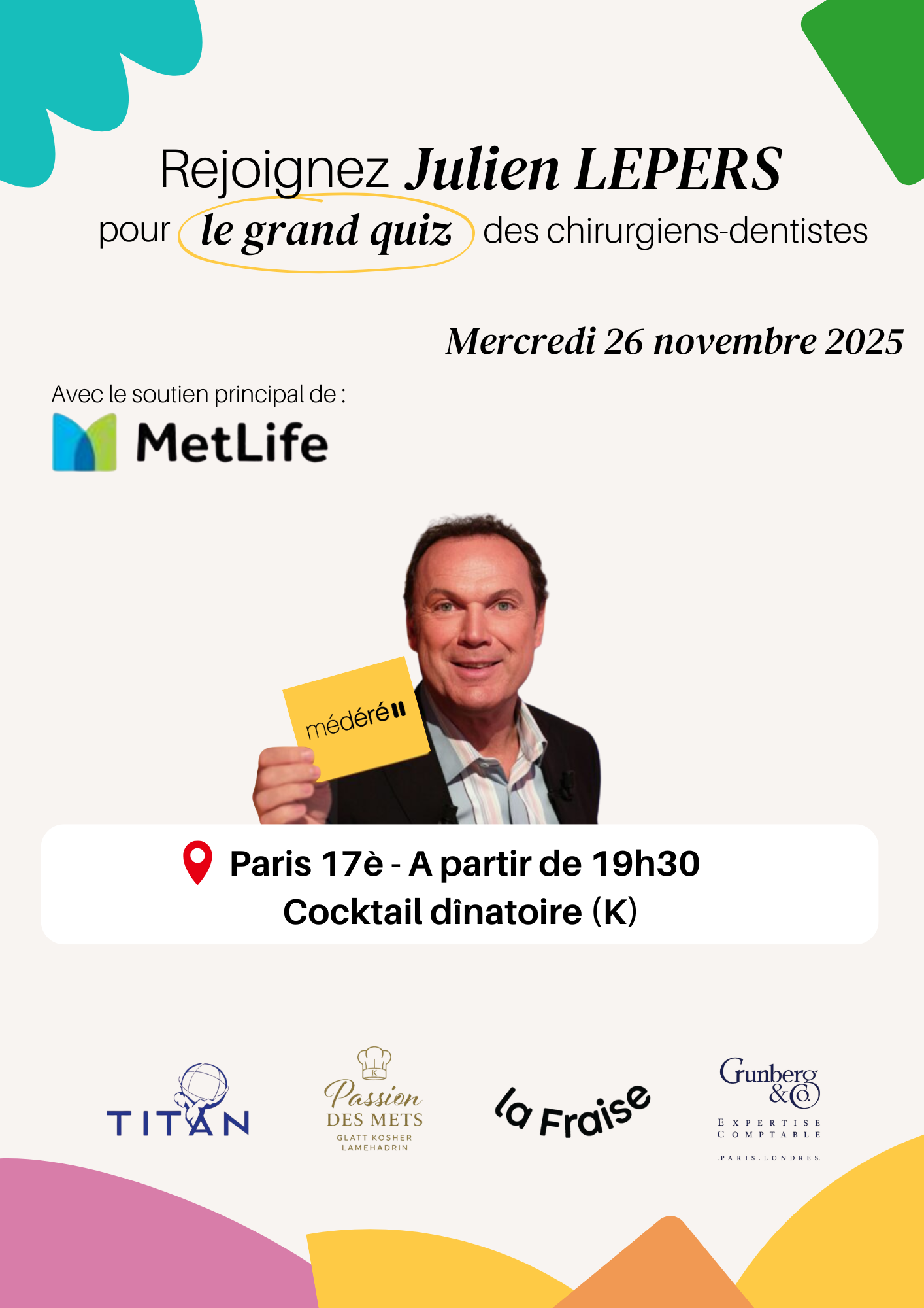 Venez seul(e) ou avec vos confrères & consœurs pour jouer et remporter des lots exceptionnels au Grand Quiz Médéré des chirurgiens-dentistes animé par Julien Lepers !